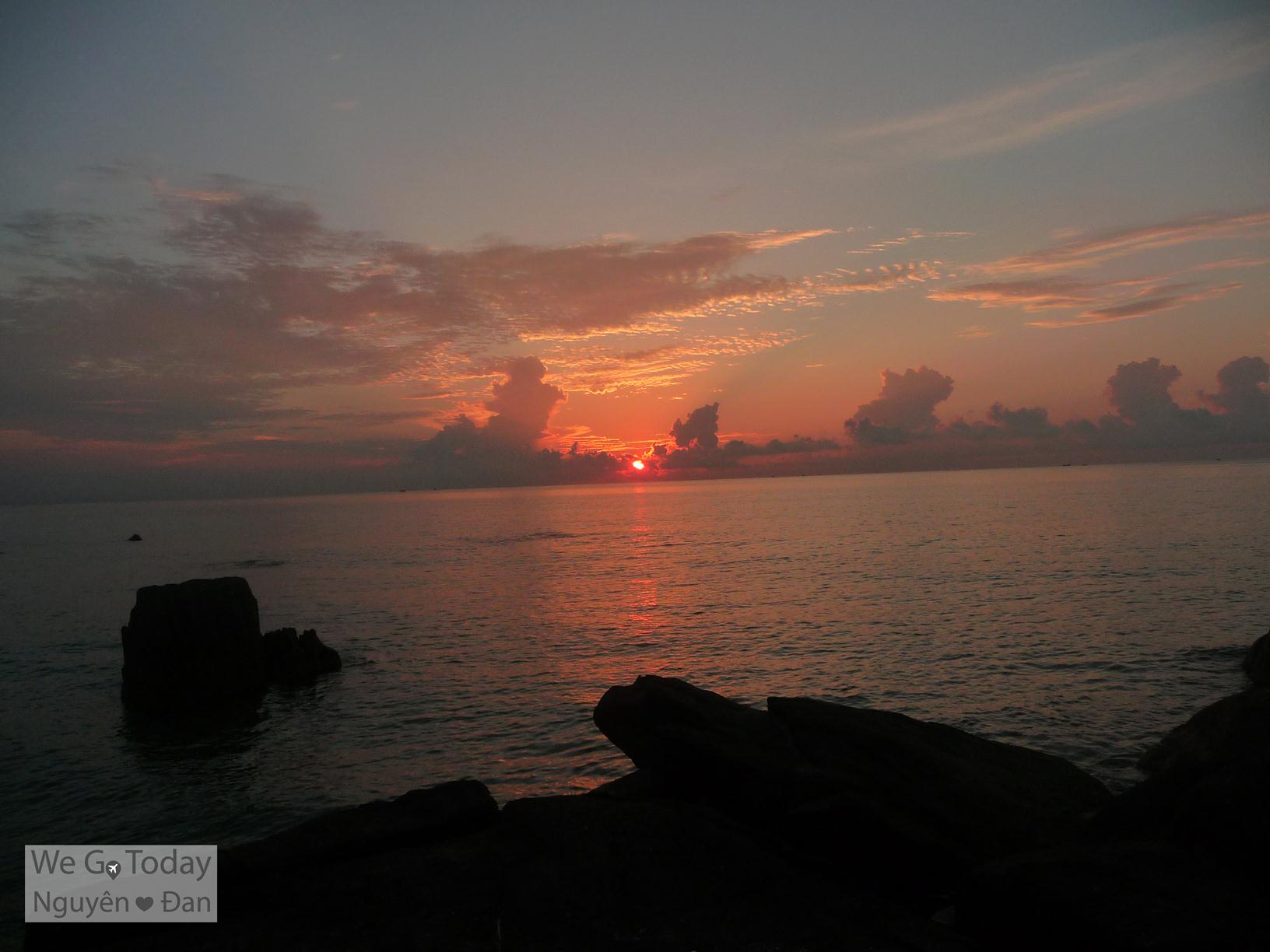 Vượt qua đoạn đường từ nhà tới ngã 3 chợ Hàm Minh, rẽ vào ngã 3 Hàm Minh – Thuận Quý. Đường này tuy rừng không nhiều bằng Phú Quốc. Nhưng vẫn thấy khá vắng vẻ. Băng qua tầm 15-20km, chúng ta đến được Suối Nhum. Ở đây nhìu resort lắm. Chạy thêm tí nữa đến đc Kê Gà. Chọn 1 đoạn đường rẽ vào biển (thật ra thì cũng không biết chổ nào ngắm đẹp nhất, mình thấy chổ này nhìu đá. Đoán là đẹp nên rẽ vào thôi :D). Đúng lúc đồng hồ chỉ 5h38p. 1 khoảng bầu trời đỏ rực. Dựng xe ở gần đó, 2 đứa tung tăng đi bộ ra bờ đá, leo lên và tận hưởng Bình Minh trên Kê Gà…quá lãng mạn. hehe.