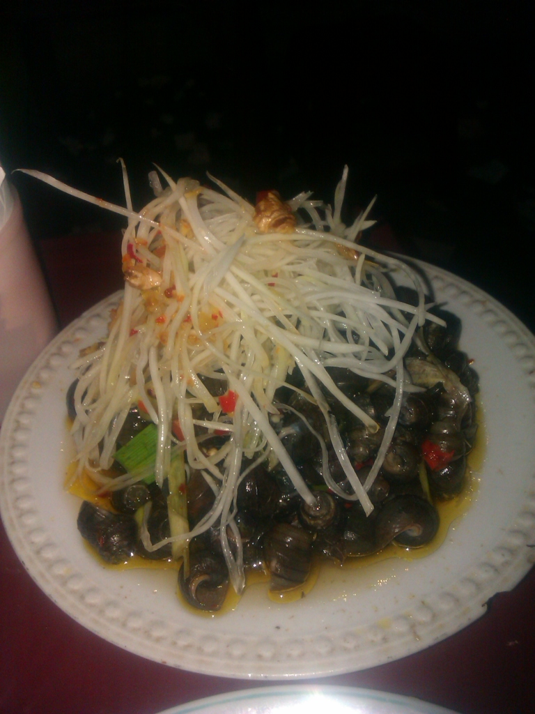 Chà, ốc hút, đúng rồi, cái món ốc thần thánh này, bạn tuyệt đối là không nên bỏ qua khi đi đến Đà Nẵng nhé. Mình chỉ nhớ là quán ốc Kiều, nhưng không nhớ chính xác địa chỉ ở khúc nào. Tối đó hai đứa mình vào quán ốc Kiều để làm 1 đĩa ốc hút hết 25,000đ. Đĩa ốc đầy vun, bên trên trang trí bằng đu đủ giòn giòn, ăn cực kì ngon. Phải nói là khi bạn đã nếm thử thì sẽ không dừng lại được 🙂