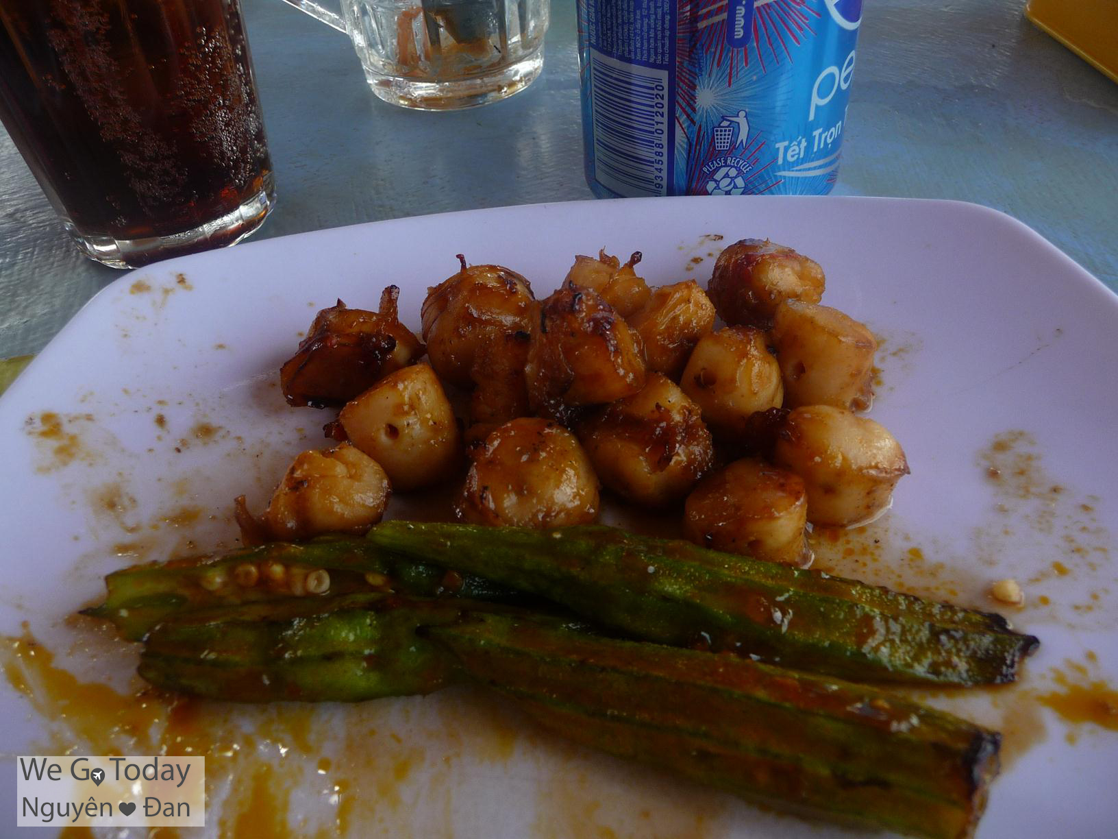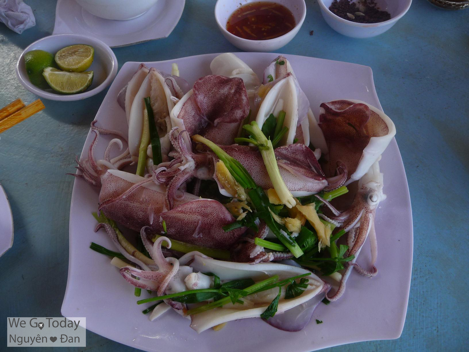 Vừa chụp được một ít ảnh và về lại quán ăn thì bạn Nguyên phát hiện ra mấy ghe đánh cá mới cập bờ, bạn ấy mon men lại gần xem xét tình hình. Sau một hồi thương lượng thành công, bạn ấy đã mua về cho hai đứa được gần chục con mực tươi roi rói, vừa đánh ở biển lên với giá chỉ 100,000đ. Hai đứa đem luôn vô quán ăn nhờ chủ quán hấp hành giúp, rồi hai đứa cũng gọi thêm còi sò điệp nướng và nước ngọt để chuẩn bị măm măm 😀 Thật ra là hai đứa muốn ăn thử nhum, nhưng mà quán này không có 😦