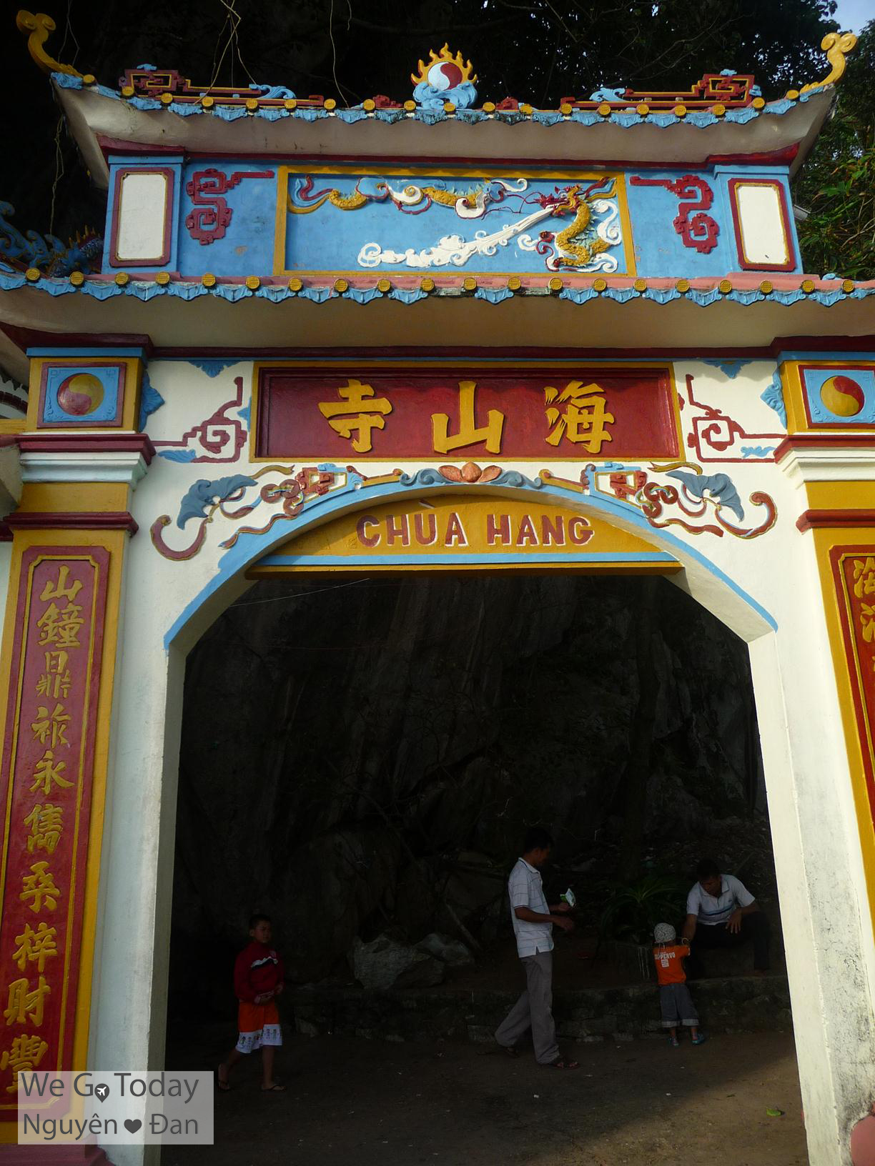 Nhờ luộc xong, hai đứa bắt đầu đi bộ dọc bờ biển và tiến đến Chùa Hang. Chùa Hang, còn được gọi là chùa Hải Sơn, nằm trong khu du lịch Hòn Phụ Tử. Nhưng có lẽ là do tụi mình đi tham quan buổi chiều nên không còn người thu soát vé. Bình thường là phải mua vé tham quan. Chùa Hang, đúng với tên gọi của nó, có hẳn 1 cái hang, thông từ chùa ra tới sát bờ biển.