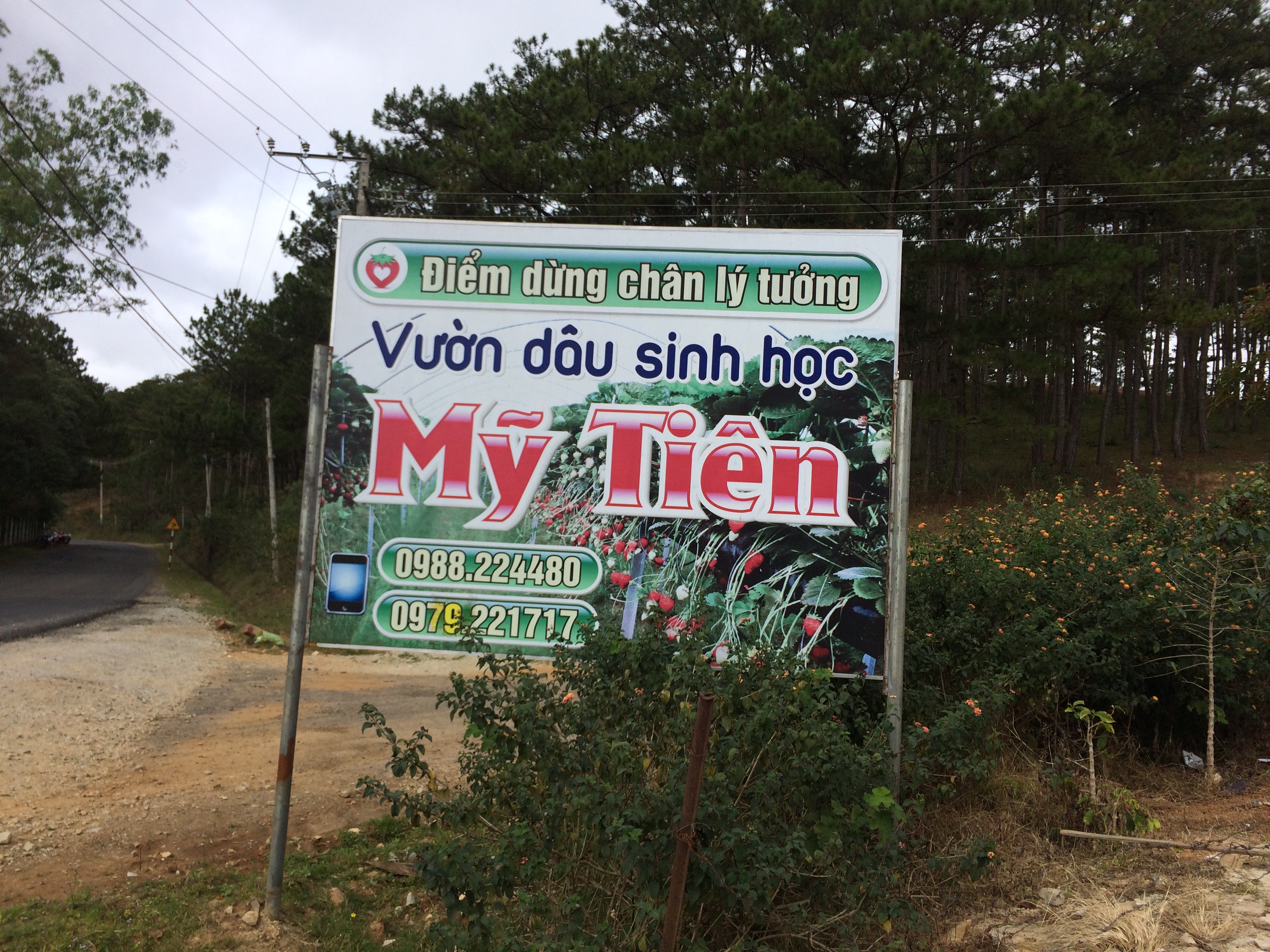 Đi thêm 1 lúc, mình lại thấy 1 vườn dâu khác, tên Mỹ Tiên. Hai đứa mình ghé vào thử, và quả là quyết định đúng đắn. Hai anh chị chủ vườn rất dễ thương và niềm nở với khách. Bạn có thể tự hái dâu ở vườn, xong anh chị chủ sẽ cân và tính tiền. Giá dâu là 70,000đ/kg. Ở đây có nước dâu ngâm đường cũng khá ngon, nhưng theo mình là mắc vì tận 15,000đ/ly.
