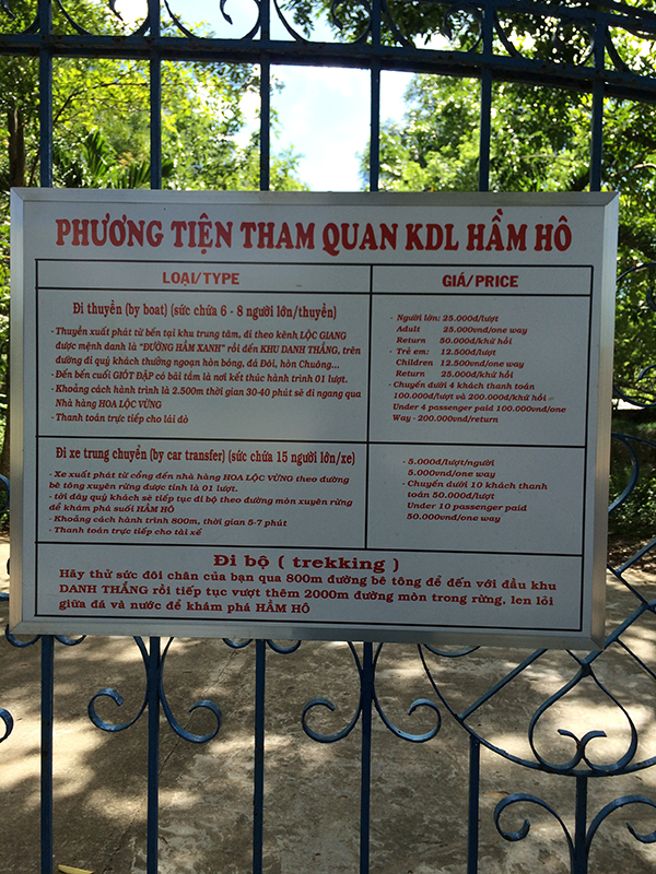 Do chân anh đang đau + rỉ máu hoài nên tụi mình quyết định đi xuồng để tham quan khu Hầm Hô. Giá vé đi xuồng tham quan là 25,000đ/ người lớn. Nhưng đoàn dưới 4 người thì tính 1 chuyến là 100,000đ. Đoàn mình 3 người vẫn phải trả 100,000đ/ chuyến. Vừa đi, vừa về hết 200,000đ. Nhưng đi đò thì chỉ tham quan được 1/3 khu Hầm Hô thôi. Muốn đi hết thì phải đi bộ phần còn lại.