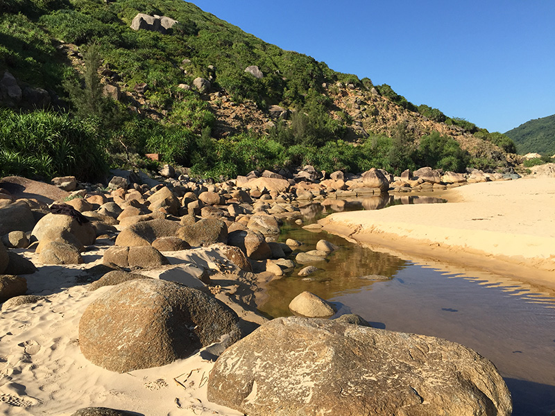 Còn 1 ngã rẻ bên trái, là hướng đi Bãi Môn, 1 bãi biển đẹp đến mức khó tưởng tượng, nơi có con suối mát lạnh, chảy ra biển. Màu biển trong xanh, kèm với bờ các trắng và mịn. Dân du lịch thường đến đây để cắm trại, nướng đồ ăn, hát hò.