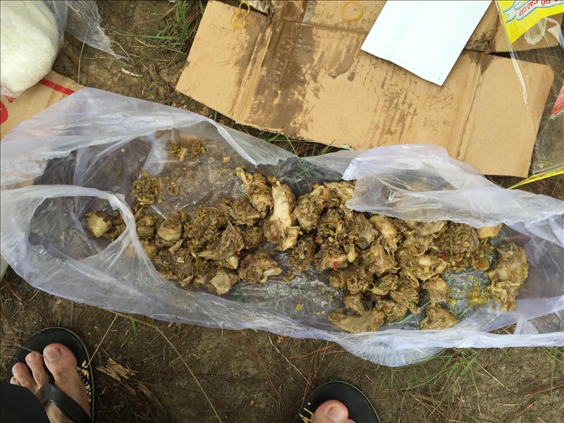 Trước khi đi, nhóm đã điện thoại cho anh Hiệp – 0972401556 – xe 16 chổ đón tại ngã 3 Tà Hine để đi vào giá là 1.000.000đ. Trước khi tới điểm bắt đầu trekking, xe có dừng tại nhà chị An – 01698732847 để ăn sáng, lấy đồ ăn cho ngày đầu tiền gồm 5 con gà (2 con đã kho sả ớt, 3 con đã làm sạch để nướng), cơm trắng, trứng gà, nước và sữa.