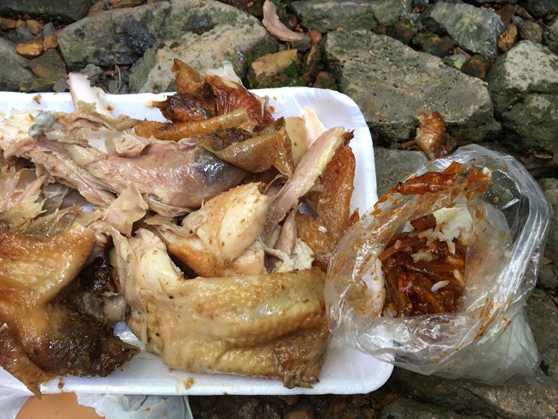 Đến tầm 12h trưa, cả đám lựa một bãi đá để ngồi ăn trưa với các món đã được chuẩn bị từ sáng sớm: Cơm nắm với cá khô và gà nướng mua ở siêu thị từ tối hôm trước.