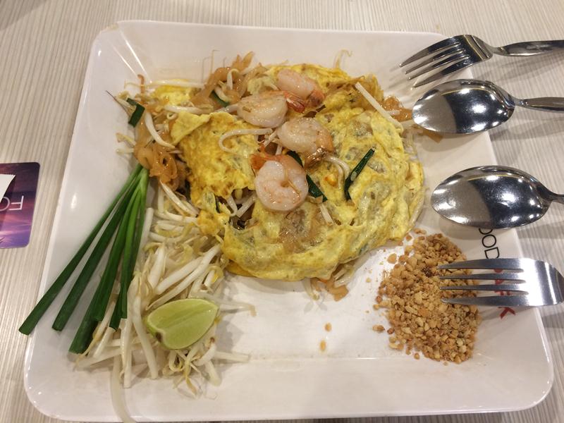 Cũng giống như những Food Court khác, tụi mình tới mua thẻ và nạp 300B. Món ăn đầu tiên tụi mình chọn là Pat Thái với giá 65B, Papaya salad (nộm đu đủ) 70B, một đĩa cơm với món thịt kho nhìn giống thịt khó trứng ở Việt Nam, nhưng khác ở chỗ Pattaya dùng nguyên 1 cái chân giò để hầm nhừ, giá1 đĩa 80B và cuối cùng là chè khoai lang với sương sáo hết 40B.