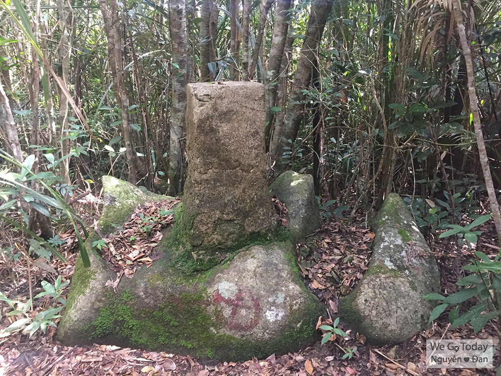 Băng qua 2 cái đổi nhỏ, tụi mình phải đi vào khu vực rừng ẩm, khu này có rất nhiều vắt, nên cả nhóm phải xịt thuốc và đi rất nhanh để tránh tình trạng bị vắt cắn. Vượt qua khu đầy vắt này, nhóm tới được cột mốc Núi Chúa. Tại đây có 2 cột mốc, 1 cũ và 1 mới.