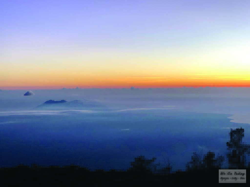 Khi tụi mình lên đến đỉnh Ijen, đã có kha khá số lượng khách du lịch ngồi chờ sẵn, set-up máy chụp hình, chờ mặt trời lên. Cảnh mặt trời mọc ban đầu cũng không đẹp mấy, không bằng cảnh ở Bromo.