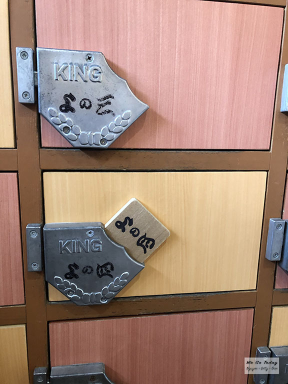 Cuối cùng, tụi mình vào một chỗ tắm onsen, hay còn gọi là tắm suối nước nóng. Chỗ này chia làm 2 khu cho nam riêng, nữ riêng. Đầu tiên là mua vé vào, ¥900/người lớn. Vào trong rồi thì cất giày vào tủ và giữ thẻ lấy giày. Tiếp đến là cất các vật dụng cá nhân khác vào 1 tủ khác, tủ này thì có cọc ¥100/tủ, tiền cọc sẽ được hoàn trả khi bạn lấy đồ lại.