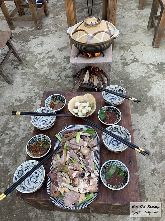 Tại Núi Hoa, tụi mình đã có buổi ăn trưa với các bạn bên Hà Giang Trẻ với món đặc sản tại đây, Lẩu Bò Cao Mã, cải xào với thịt gác bếp, rượu ngô.