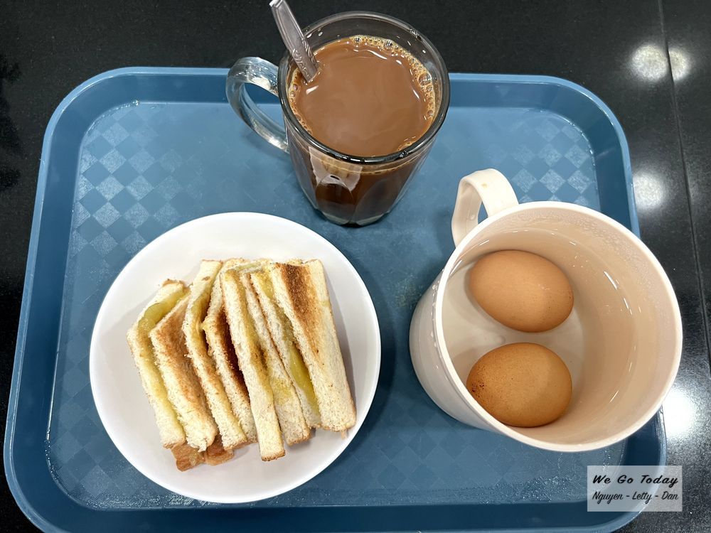 Theo route cũ hôm qua, tụi mình đi ra trạm MRT Bugis – line xanh biển, rồi đến City Hall, xuống trạm, đổi line đỏ, đi đến Khatib. Ở trạm MRT Khatib, tụi mình ghé Giant mua thêm ít dâu, blueberry, mận. Rồi ghé quán ăn sát bên để ăn sáng. Tụi mình gọi 1 set bánh mì nướng, trứng luộc, cà phê – giá khoảng $4.