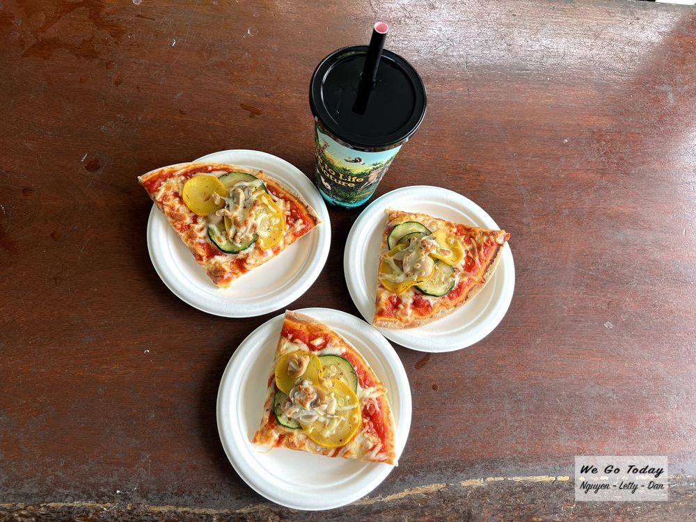 Xem xong, tụi mình đi dọc theo hướng trạm tram số 3 → 4, ăn trưa mỗi đứa 1 lát pizza phô mai cà chua, rồi lại tiếp tục đi dọc theo hướng trạm tram 4 → 1, qua khu Kidz World.
