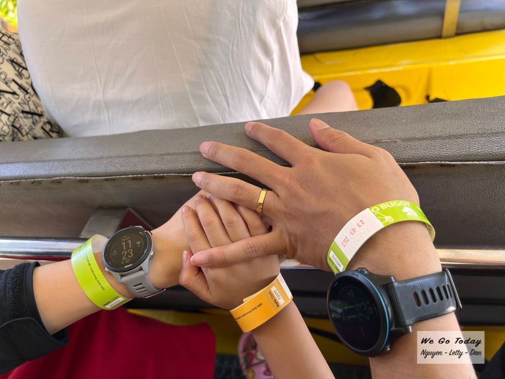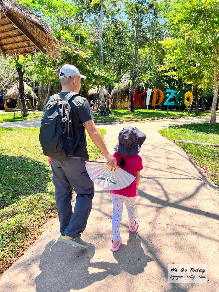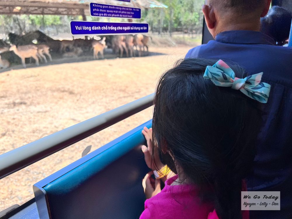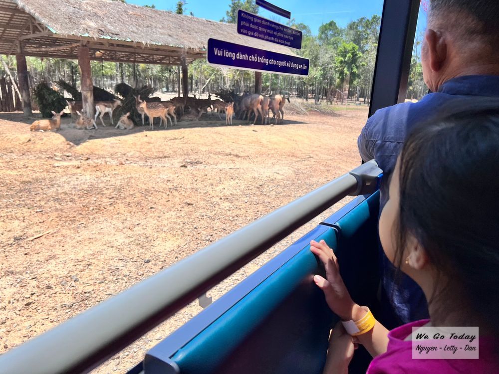 Vừa vào trong Safari, tụi mình tới quầy bán vé xe điện, mua vé để tiện di chuyển trong nội khu. Vé người lớn 100k, vé trẻ em dưới 1m2 là 80k. Theo mình thì đây là ưu tiên hàng đầu khi đi chơi cùng em bé nhỏ, vì các bé dễ mệt, có xe hỗ trợ di chuyển sẽ tiện tham quan hơn.