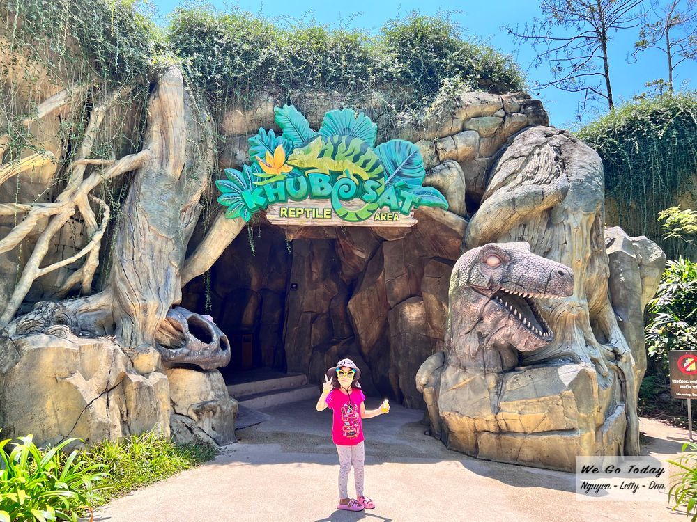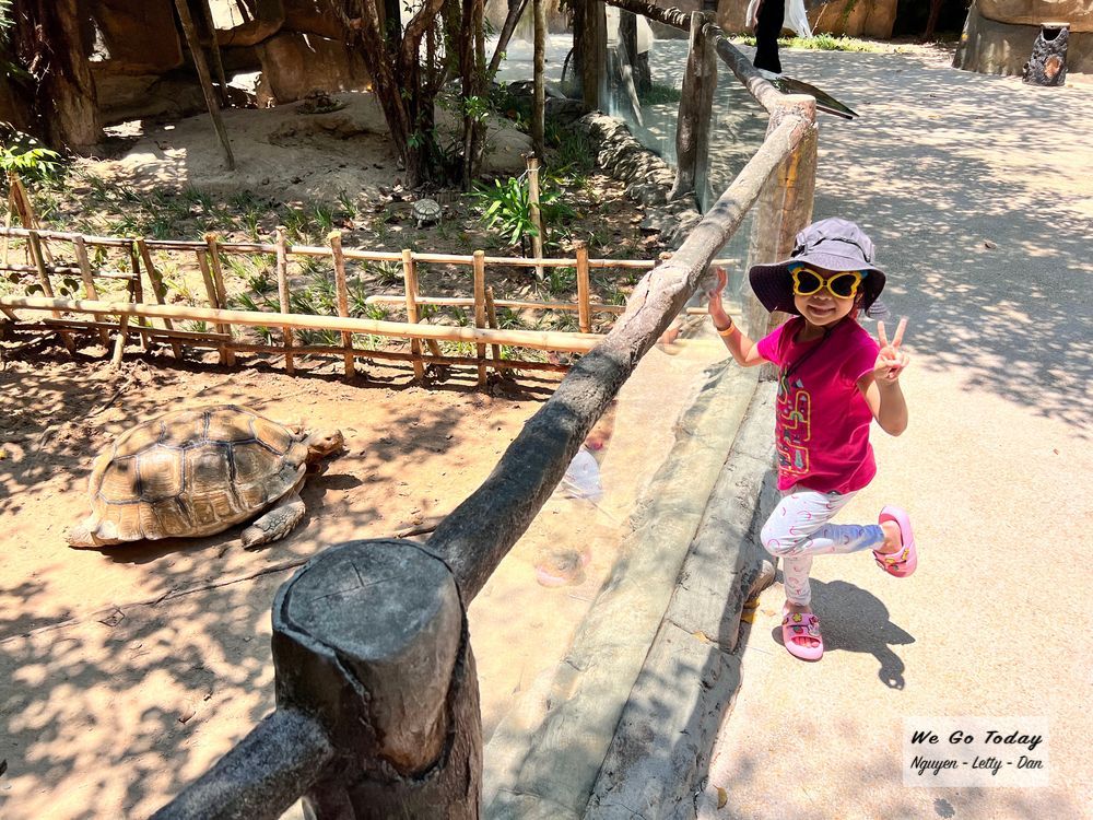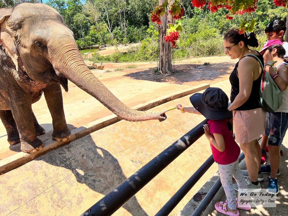 Safari có các show diễn của chim và của bộ lạc Châu Phi theo các khung giờ nhất định, nên tụi mình luôn ưu tiên đi xem các chương trình này đúng giờ. Thời gian còn lại, tụi mình tham quan các em thú vật khác. Đi xe điện đến trạm dừng chân đầu tiên, tụi mình tham quan khu bò sát trước, rồi di chuyển qua chuồng voi. Mình mua 2 phần thức ăn cho voi, giá 30k/ phần. Letty đợt này đã dạn dĩ hơn, dám tận tay đút thức ăn cho voi ăn.