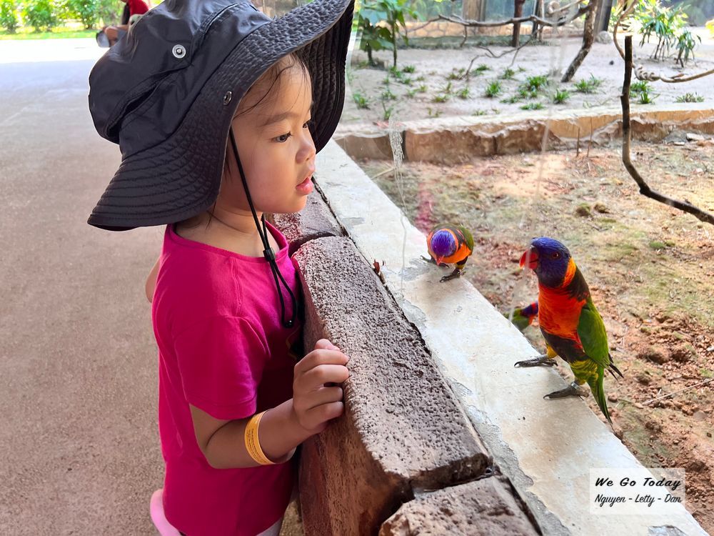 Khi đút cho em voi ăn xong, nhà mình bắt xe đi ngược ra ngoài để xem show biểu diễn của các em chim. Show kéo dài tầm 30 phút.