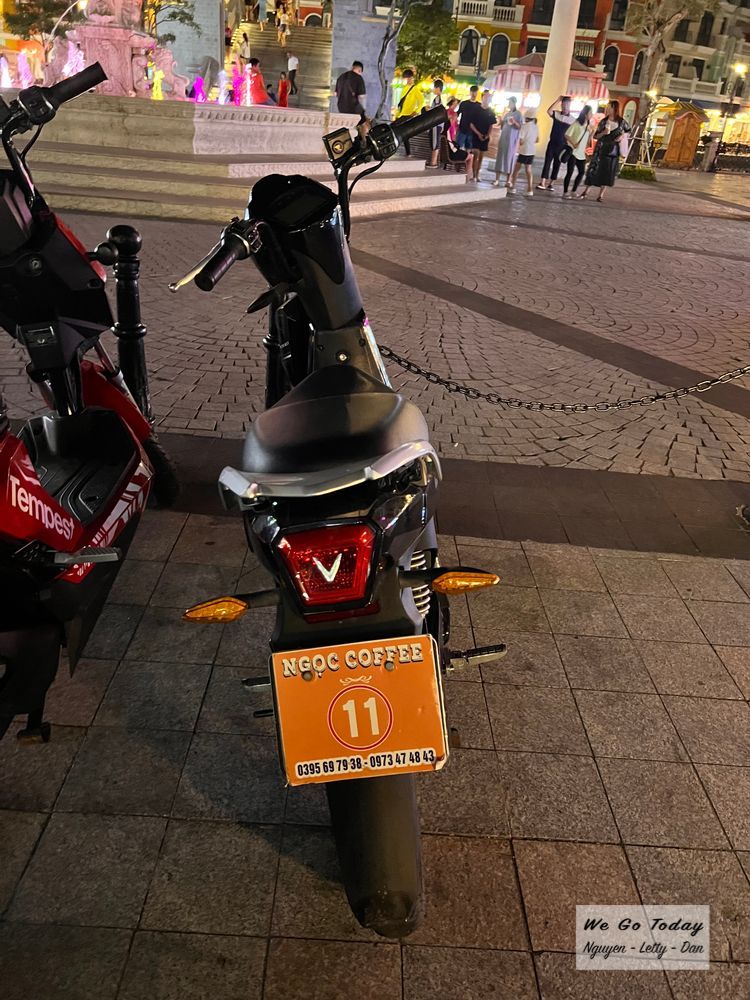 Ăn xong, tụi mình bắt taxi qua Grand World. Grand World chỉ cách Vinpearl Resort and Spa tầm 2km, đi taxi hết 50k. Đến nơi, tụi mình thuê 1 chiếc xe máy điện, giá 80k/ giờ, để đi vòng vòng ngắm cảnh. Dạo chơi tầm 1 tiếng, tụi mình quay lại trả xe, rồi lại đi taxi về lại khách sạn.