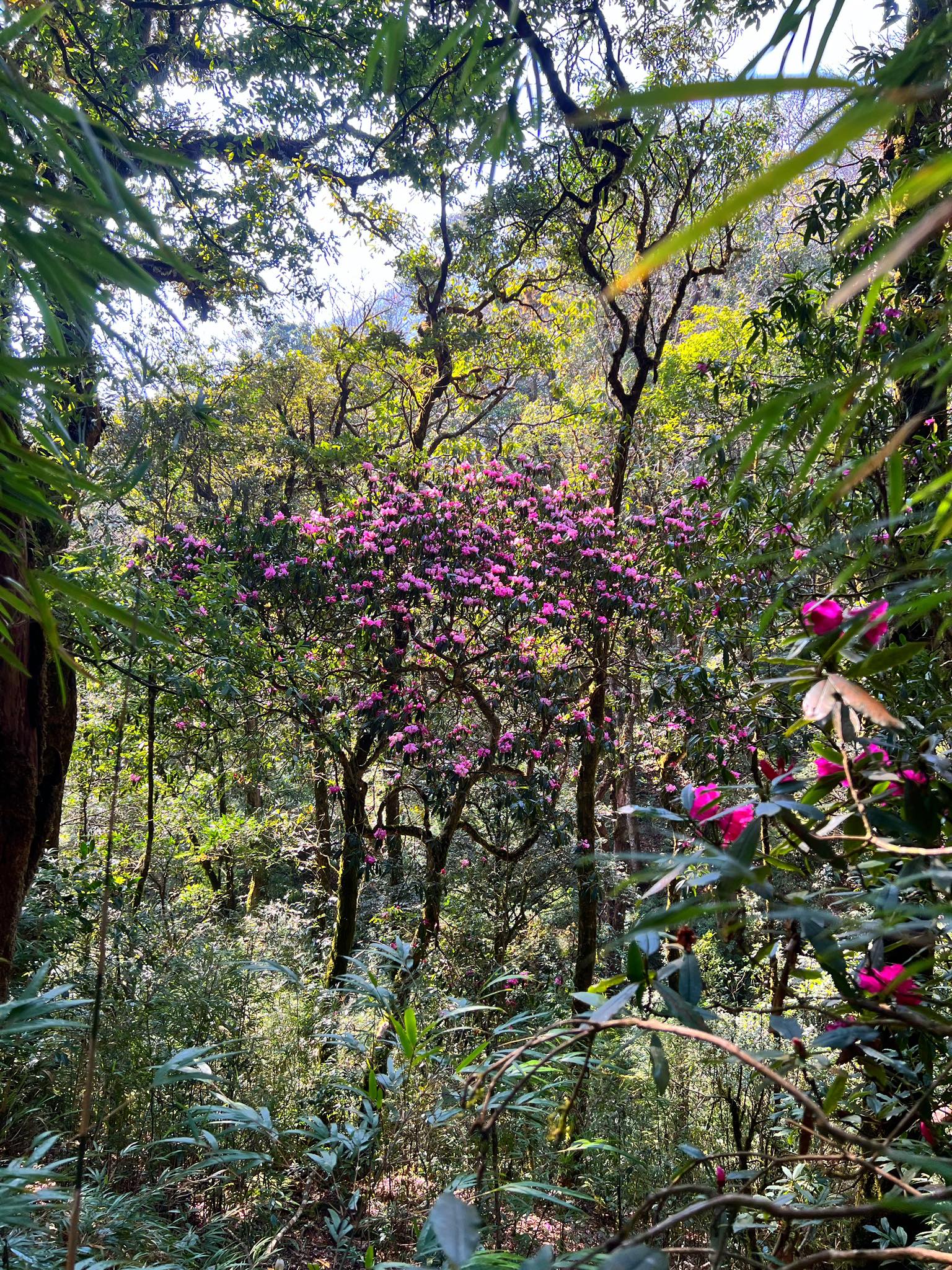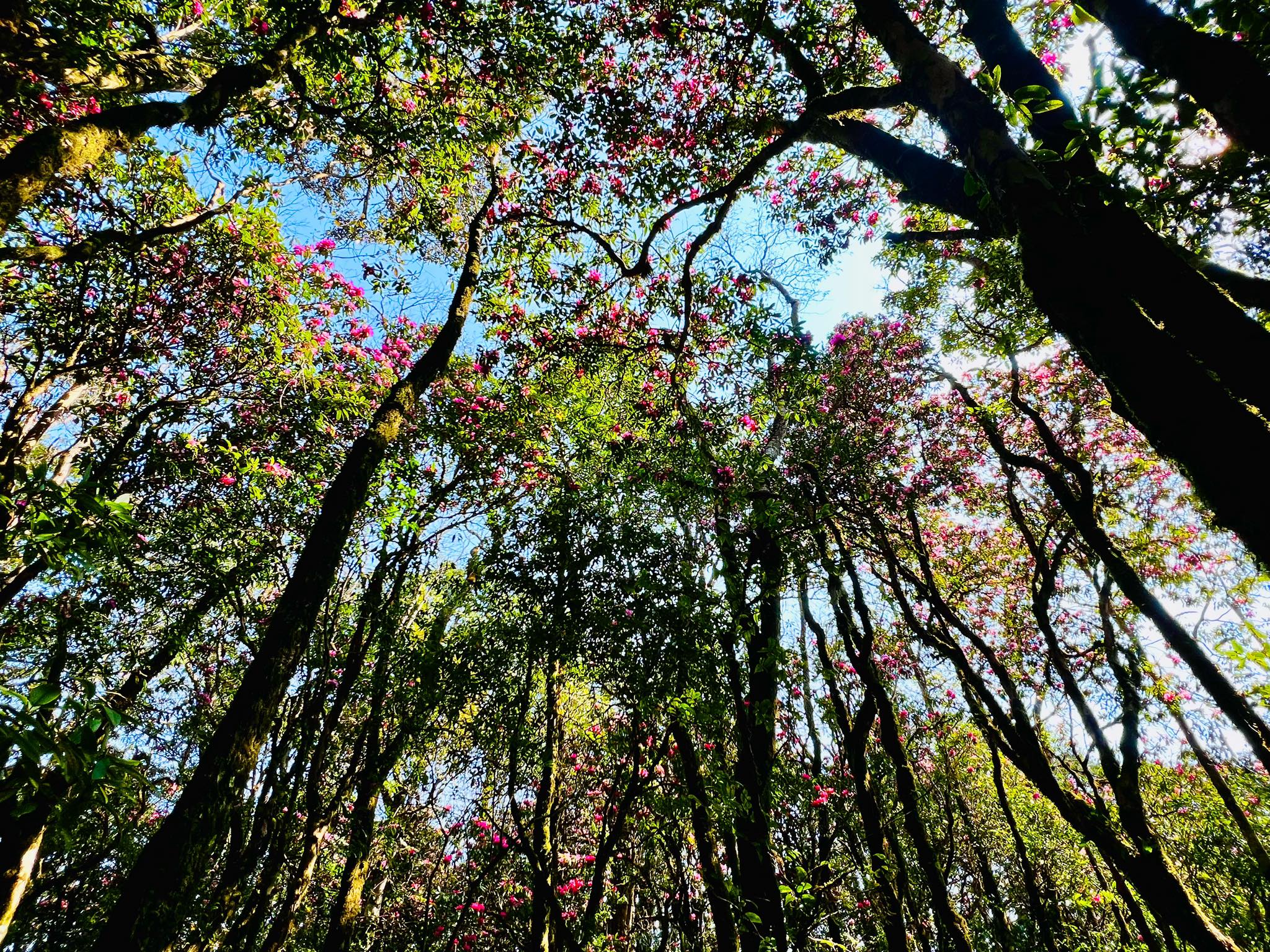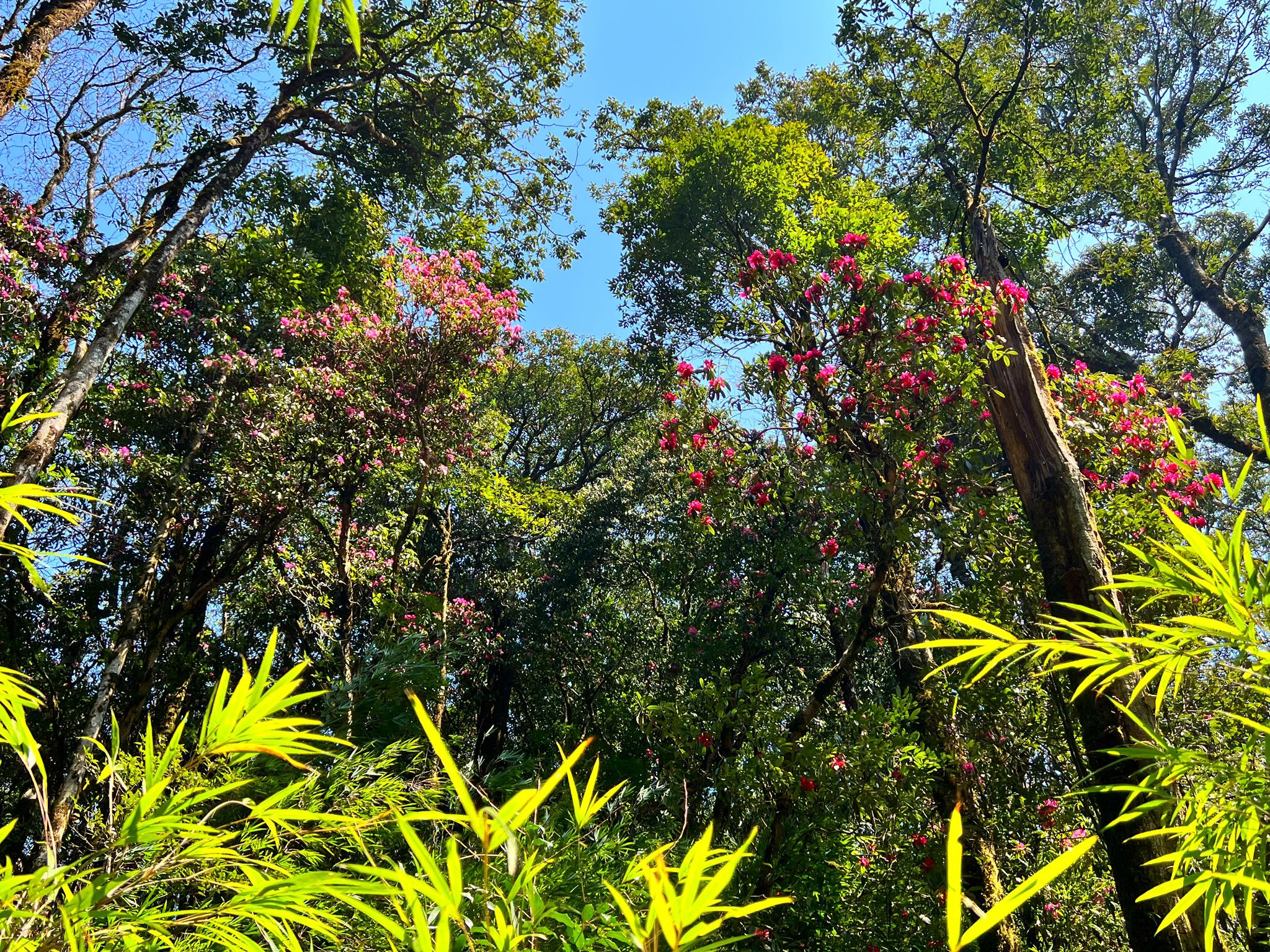 Từ lán lên tới mốc là 4km, đường dốc. Trên đường đi tụi mình thấy rất nhiều cây Đỗ Quyên cổ thụ đang nở hoa. Trong đó, có một điểm được gọi là “Đồi hoa Đỗ Quyên”, tụi mình hoàn toàn mê chỗ này.