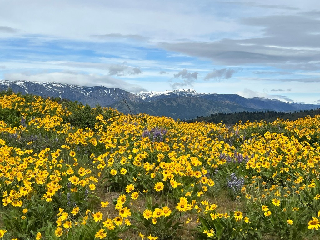 - Tháng 5 – tháng của những bông hoa dại (mình dịch từ chữ wildflowers). Vô tình xem trên Instagram, thì thấy một đồi hoa dại, màu vàng rất giống hoa hướng dương của Việt Nam, nhưng nhỏ hơn, tên gọi là “balsamroot flower”. Nên mình đã quyêt định đi đến đó, địa điểm là ở gần Cashmere, Olalla canyon.