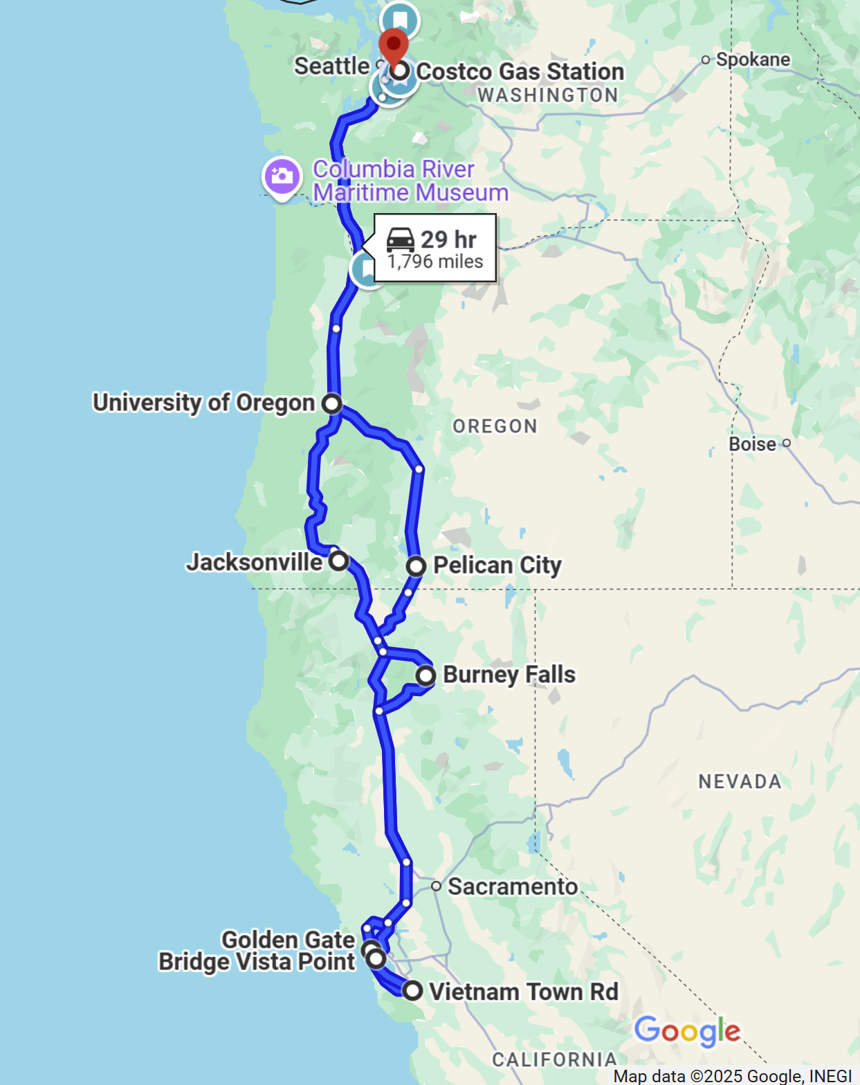 Ngày 2: Từ Pelican City (OR) tới Golden Gate (CA), nghỉ đêm ở Visitacion Valley (CA). Được tận mắt nhìn thấy Golden Gate. Vì còn dư thời gian, nên mình có chạy xuống San Jose (CA) tới khu Vietnam Town để ăn đồ Việt Nam. Tại đây có rất nhiều quán Việt Nam như là: Trung Nguyên, Phúc Long, Bún Riêu, etc.