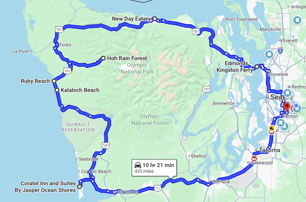 Bán đảo Olympic, bang Washington, là nơi tọa lạc của Công viên Quốc gia Olympic. Cung đường vòng quanh công viên dài hơn 400 miles mang đến một trải nghiệm đáng nhớ, trên cung đường đi, tụi mình đã đi qua rừng mưa nhiệt đới, bờ biển hoang sơ và thi thoảng có những đỉnh núi cao từ xa.