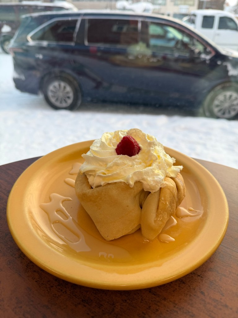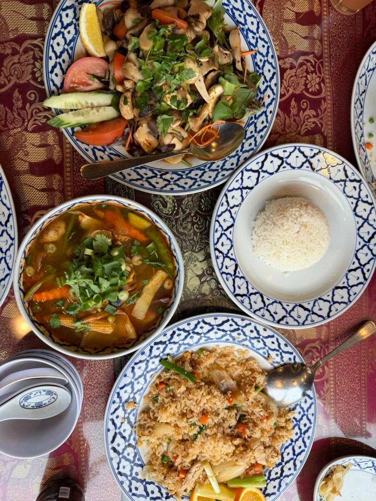 Đi chơi cũng tới lúc đói bụng, tụi mình quay về lại trung tâm, ghé vô quán Bahn Thai để ăn chính. Bữa trưa có cơm chiên tôm, tomyum, salad. Tổng khoảng $100. Sau đó tụi mình qua quán The Crepery để ăn tráng miệng. Tại The Crepery, tụi mình đã gọi món Special của quán tại thời điểm đó, gồm có mocha và mứt mâm xôi, dâu, sốt caramel. Món này có giá khoảng $12.